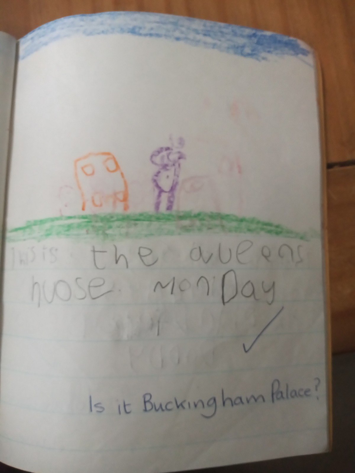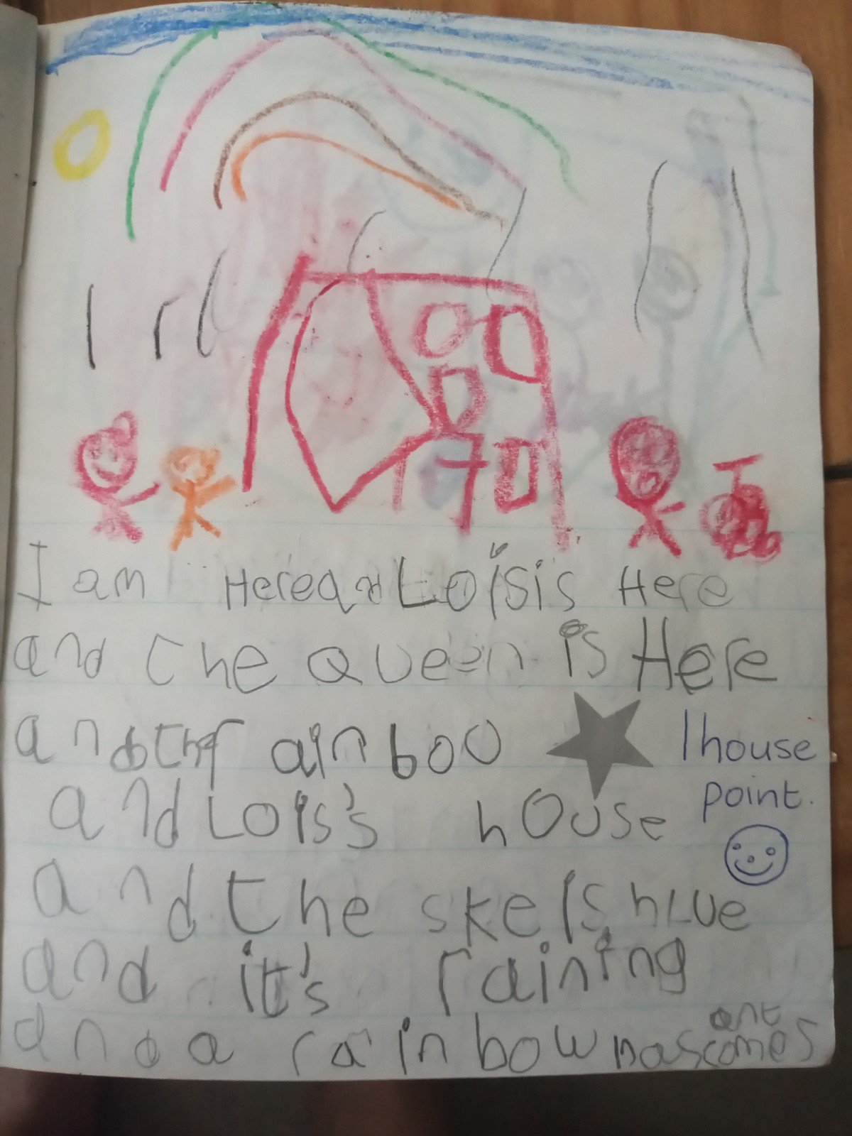I found that I wrote about the Queen, I wrote about rainbows, and I wrote about having fun at other peoples houses. I wrote about going to the Queens house.