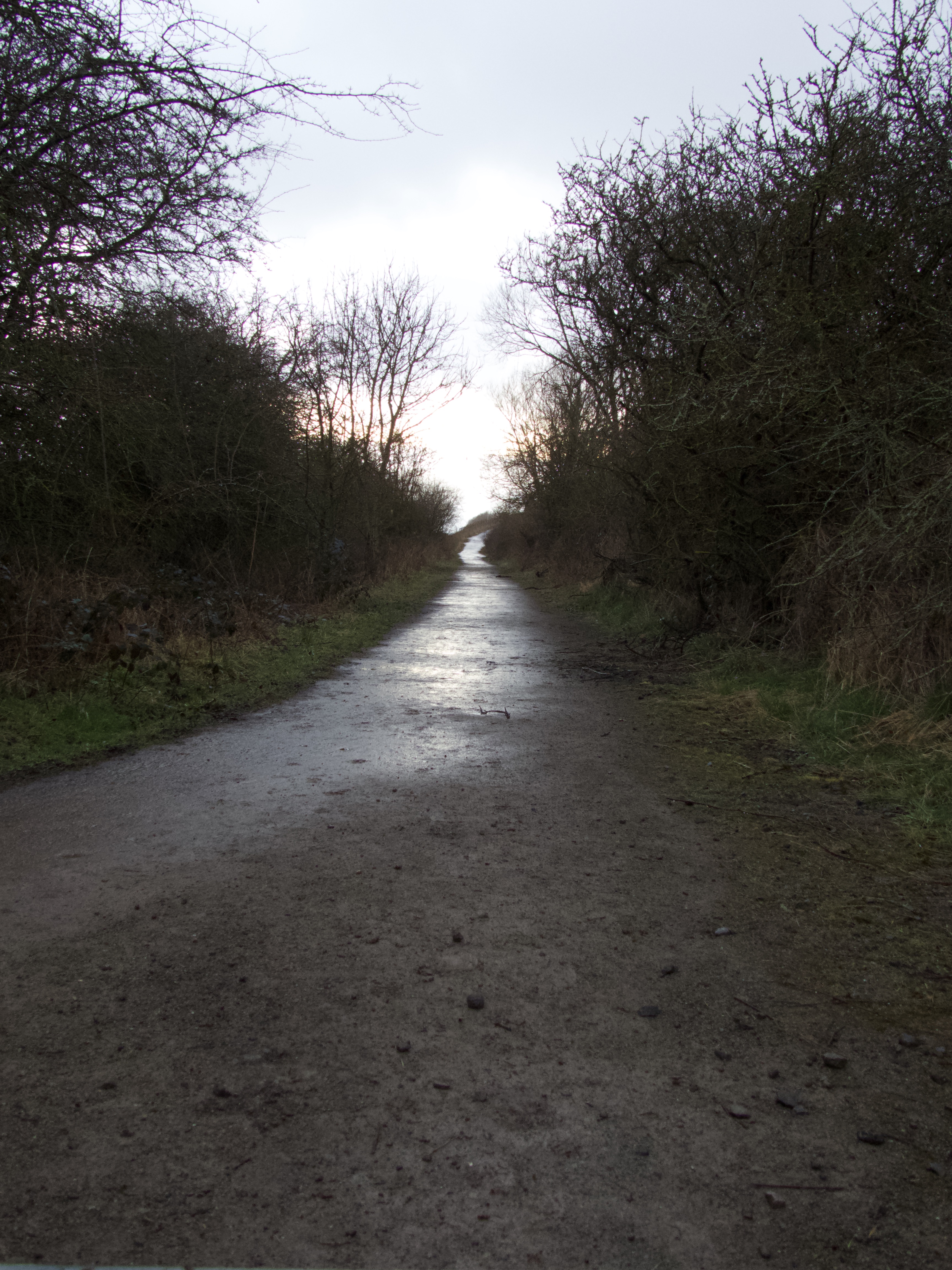 Its an ordinary path, just outside darlington with the sunset reflecting on the grey wet tarmac.