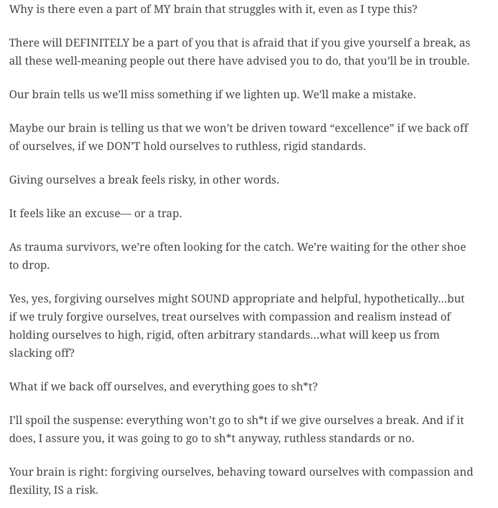 Too many times was it safer for me to revolve around others, my abusive mothers, needs than attend to my own – too many times soothing my abuser meant safety for me.