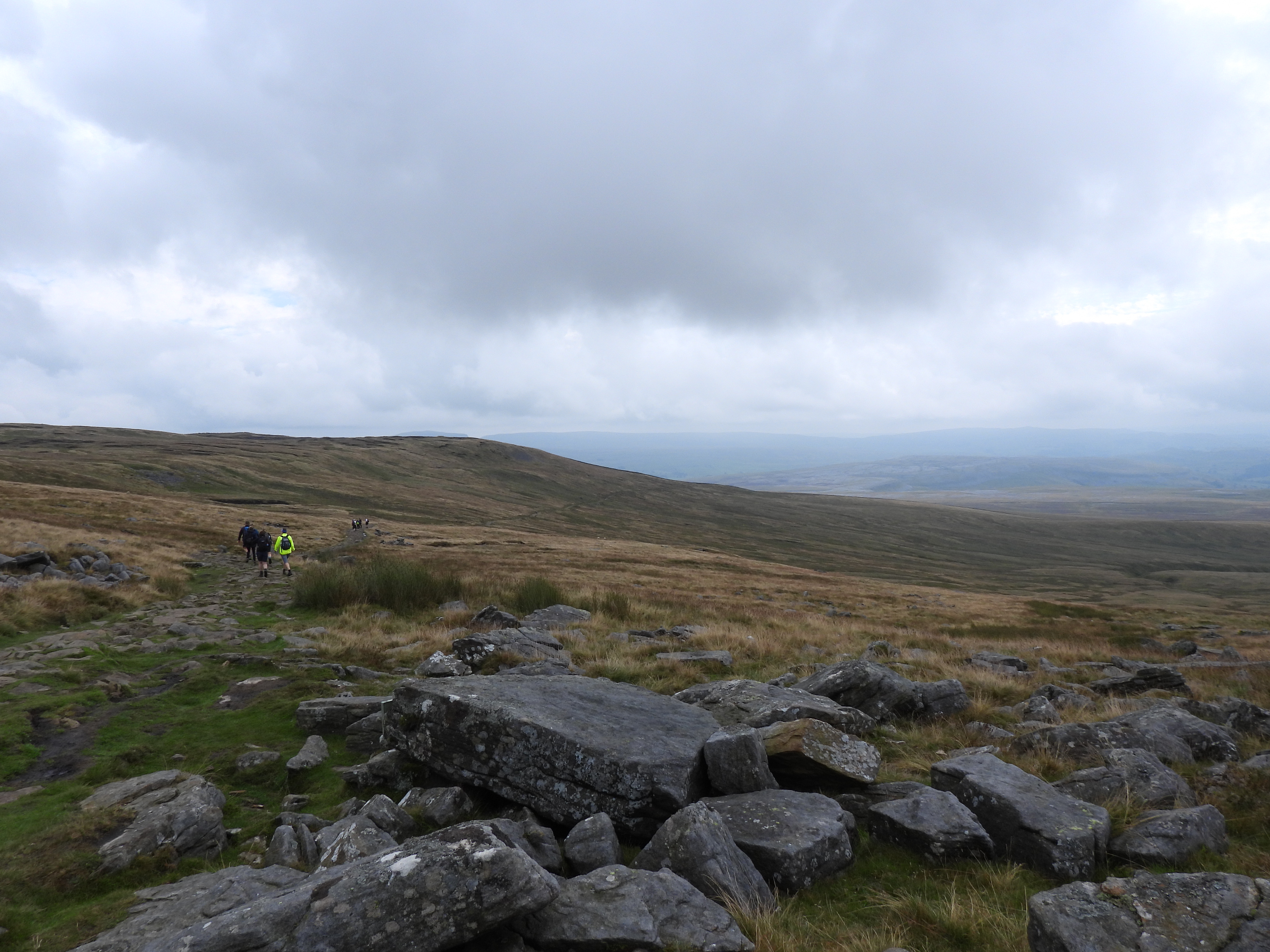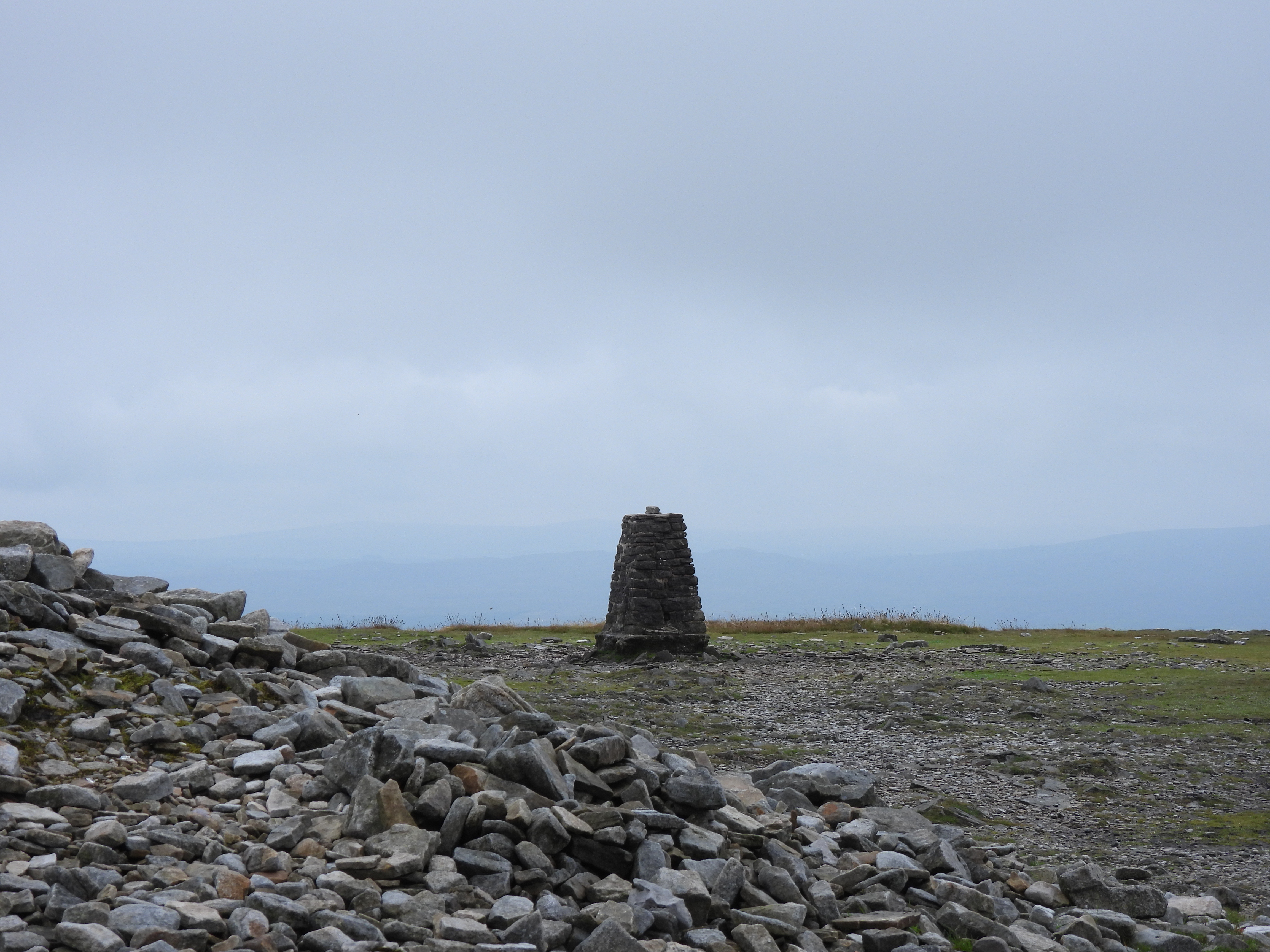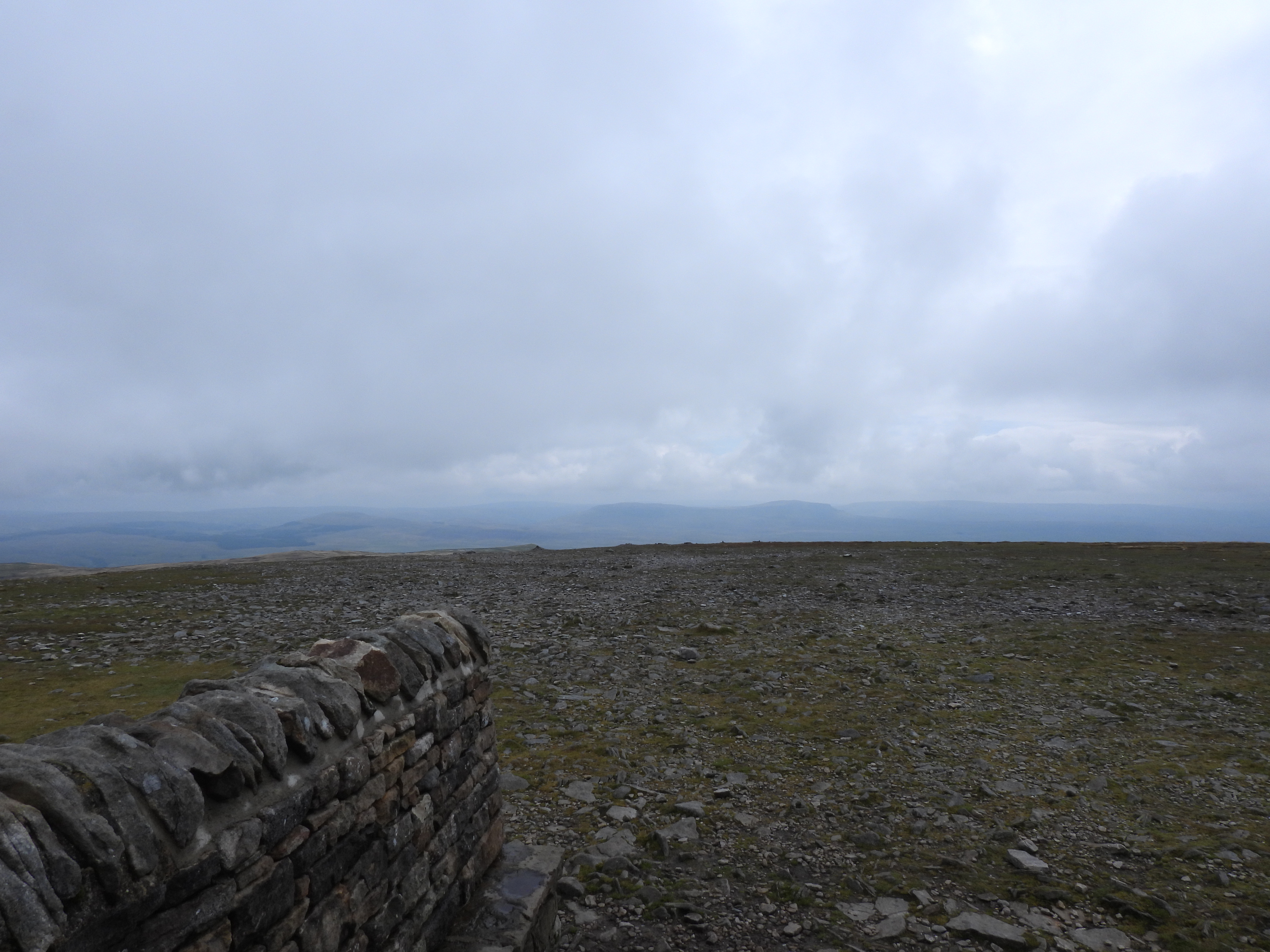 Not a peak, but a large platform, a flat space, with views of other distant heights, Pen-y-ghent peeking in the clouds and others far off.